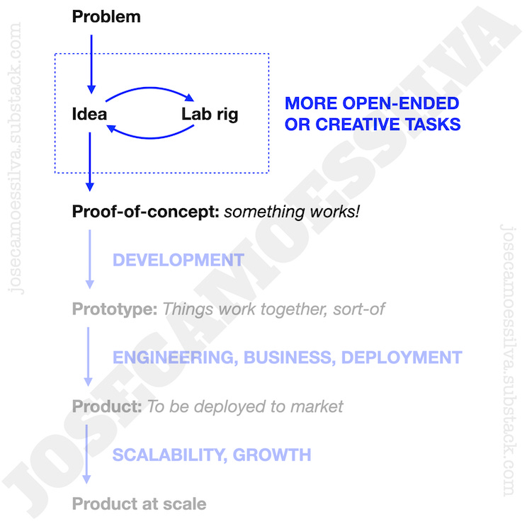 The development process has later phases that make sure products will work reliably with average people in the outside world (not just occasionally and for experts in a lab) and can be produced economically at scale. But, in the early parts, creativity is more important than those pesky engineering and business concerns, so we’re going to assume our objective is to maximize the value of the idea that gets turned into a proof-of-concept (or technology demonstration):