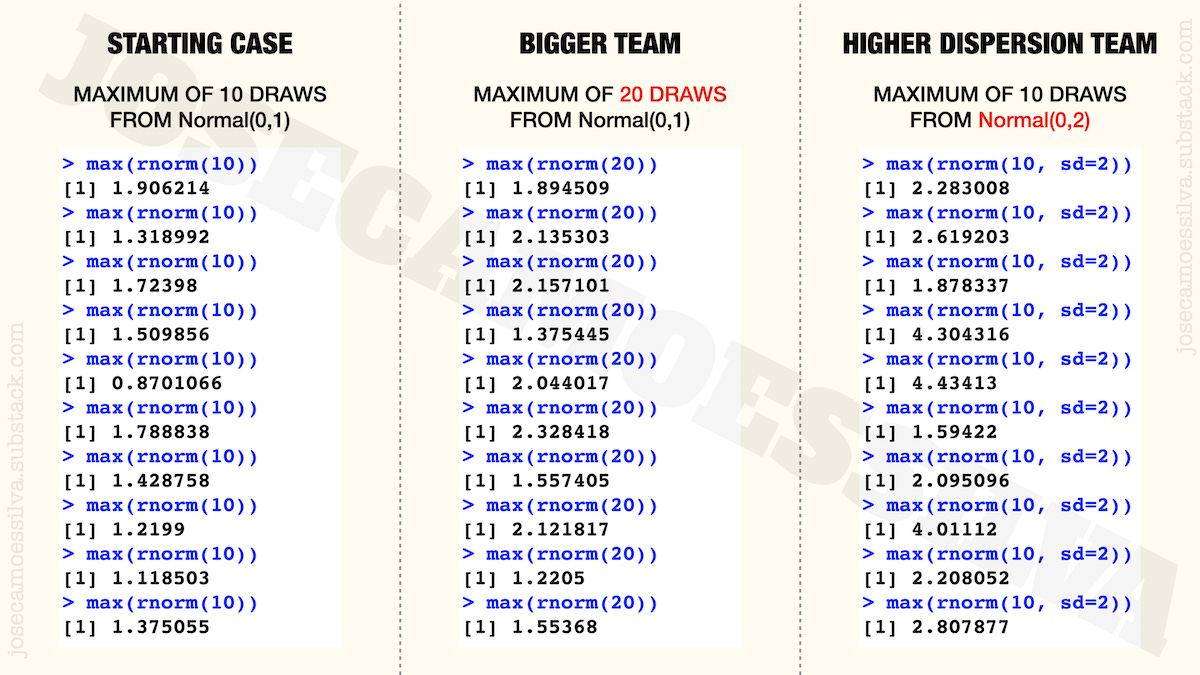 This gives us one instance of the maximum of a team; SD = 1 by default. Let’s get a few instances just to have a feel for the issues coming up.