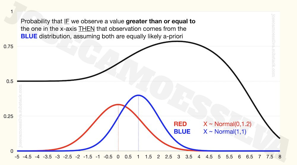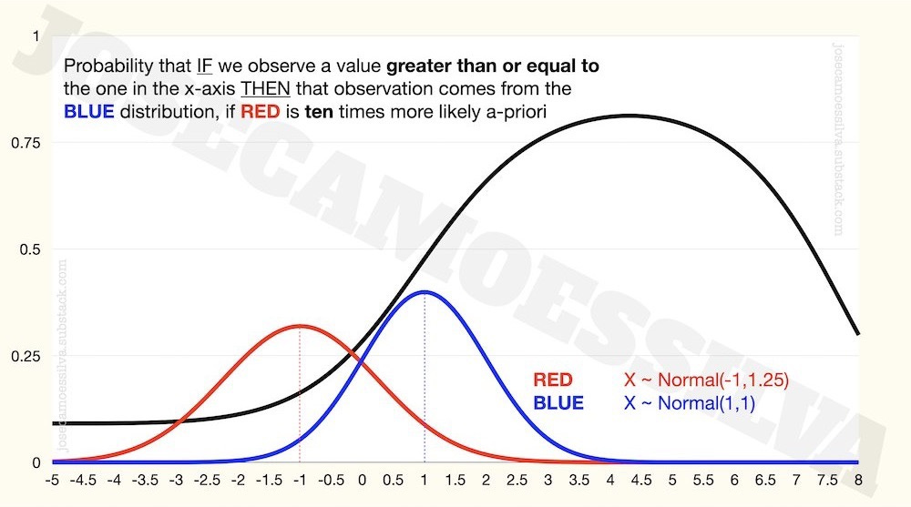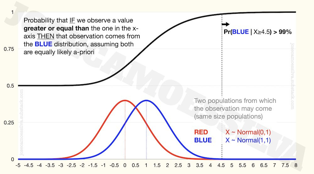 What this means: if we’re trying to determine which of these two distributions a random draw comes from, and we observe a value that is greater than 4.5 (it passes a filter that eliminates any observation with X < 4.5), then we can be 99% sure that it came from the blue distribution.4