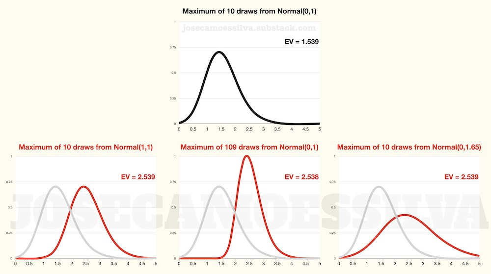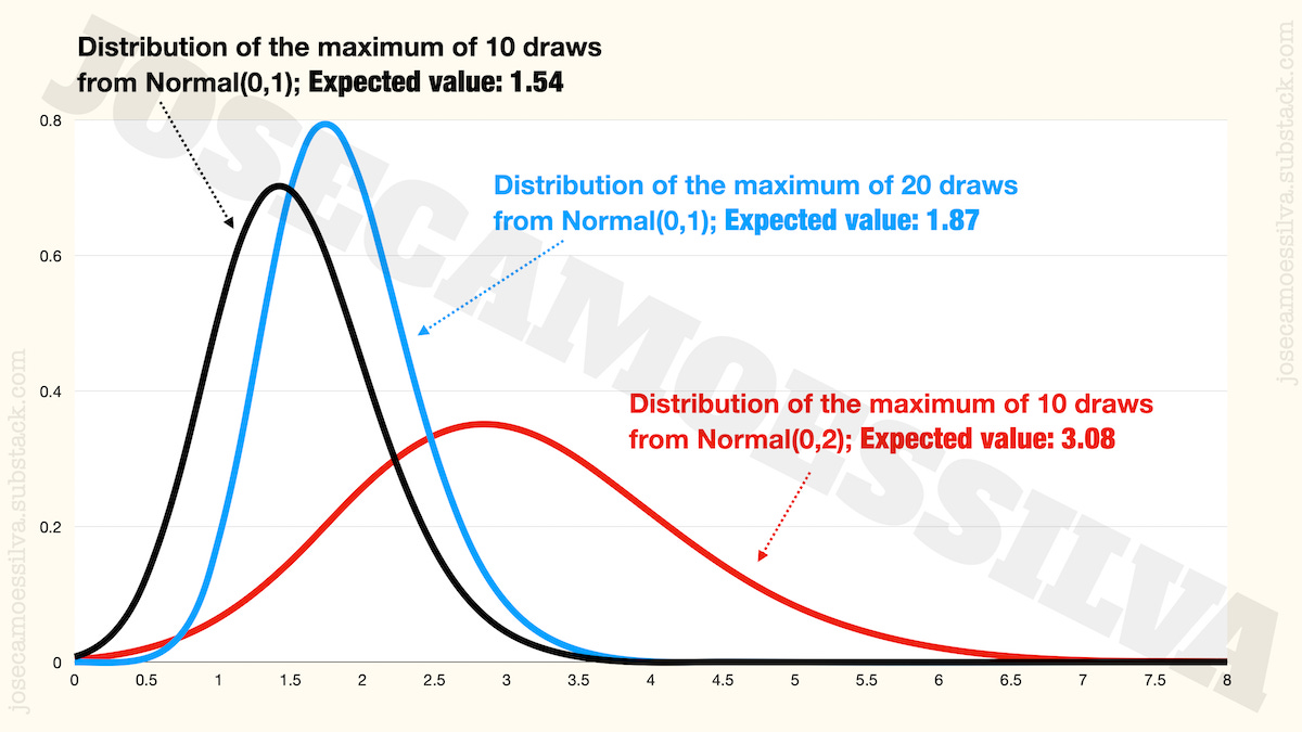 As we’ve seen above, the maximum increases with variation (the standard deviation) and the size of the sample of ideas. (It also increases with the mean value of ideas; we kept that at zero above, and will keep it here as well, since with independent draws that just adds a constant to the result — really, that’s all it does.)