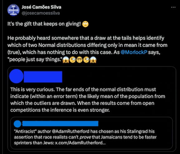 Random draws at the tail can be informative (with a lot of assumptions), but extremes by themselves are unrepresentative of mean differences, as per the bad above (the sprinters in the double-quoted tweet are competitive runners, and in a competition the winners are by definition the extremes).