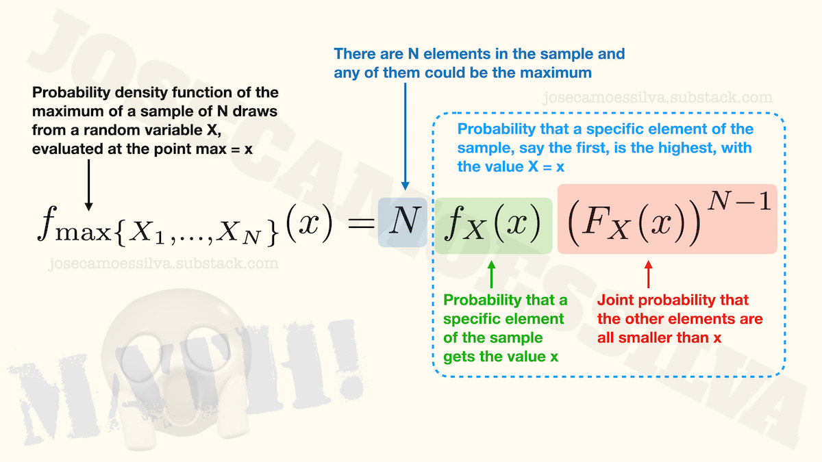 The probability that we observe a particular value x for the maximum of N draws is given by the joint probability of observing one of x and N-1 values lower than x, times the number of variables (the size of the sample) that can take the value of x,