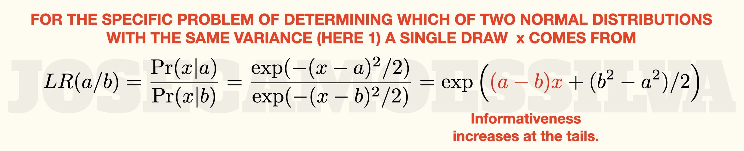 Engineers (especially the superior type of engineer, EECS 🧐) call this signal detection: when we observe one draw from one of two close distributions, if the value is near the mean of those distributions (assumed to be close in mean and with the same SD), it’s very difficult to tell which of the distributions it came from; but if it is far from the mean, it’s much more likely to come from one of them than from the other: